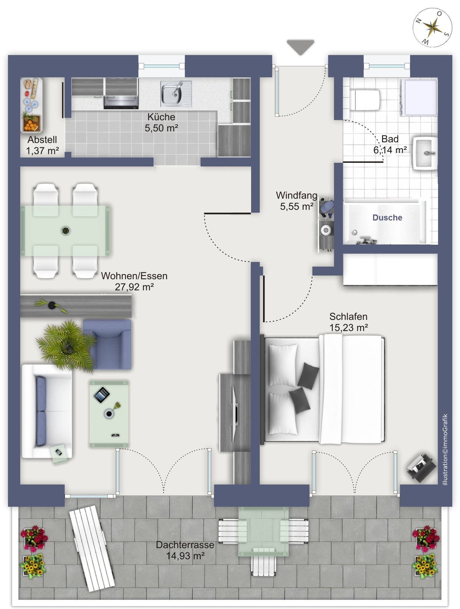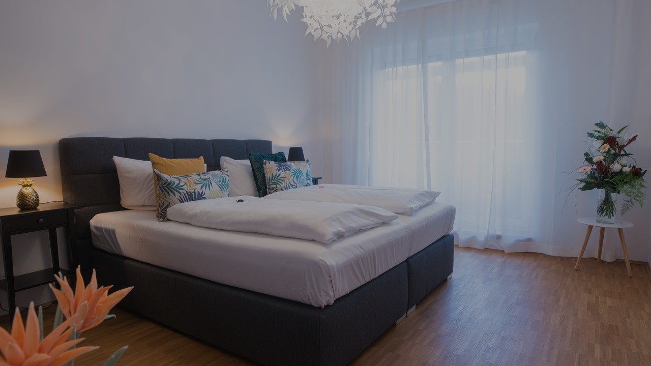 Wer will nicht dieses 60 m²-Appartment mit Dachterrasse und grandioser Aussicht genießen. Schick und stylisch möbliert, mit 2 Zimmern, separater Küche und ein Panoramablick bis zu den Alpen. Das große Tageslicht-Duschbad mit bodengleicher Dusche und Rainshower ist der ideale Ort zum entspannen und erholen. Das Appartment ist mit einem gemütlichen Kingsize-Boxspring-Bett ausgestattet, das zum langen Ausschlafen verführt. Die abgeschlossene Küche ist mit allem, was man für einen längeren Aufenthalt benötigt, ausgestattet. Die ausziehbare Bett-Couch im Wohnzimmer ermöglicht den Aufenthalt auch bis zu 4 Personen.